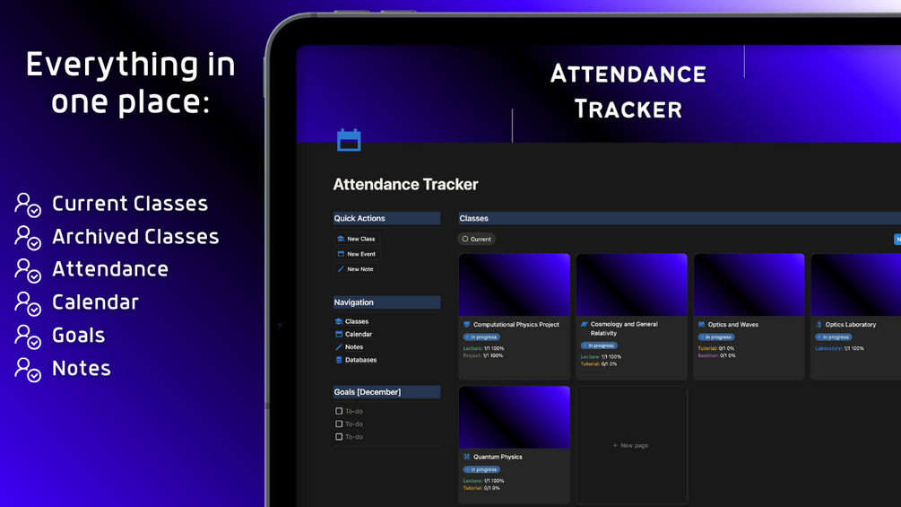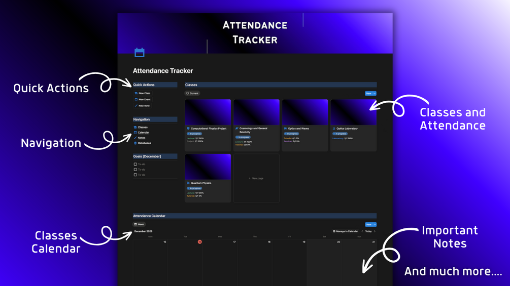 🔹 Attendance Tracker Notion template where you can organize your classes, attendance, calendar and notes and store everything in one place