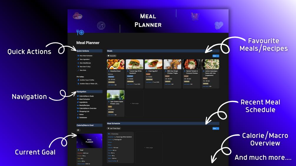 🔹 Meal Planner Notion template where you can organize and track your calorie/macro goals, meal schedule, water intake, ingredients, meals, recipes, daily calorie/macro progress, shopping list and notes and store everything associated with your healthy habits in one place