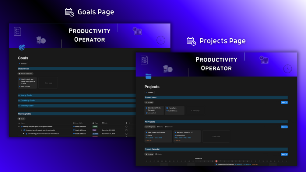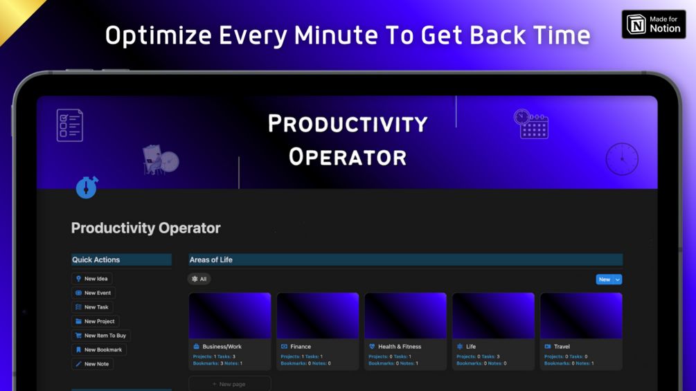 🔹 Productivity Operator Notion template where you can organize your ideas, schedule, tasks, projects, goals, shopping list, bookmarks and notes and store everything in one place