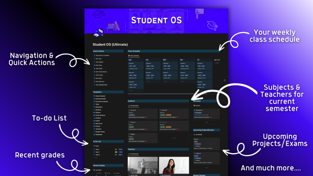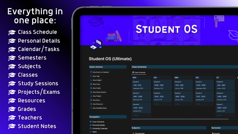 🔹 Dashboard - everything you need for your current semester. Navigation with links to every page, Class Schedule (your weekly plan), Quick Actions for easy capture & mobile use (yes, this template is also mobile friendly), Current Semester’s Subjects, Classes, Projects, Exams, Grades, Teachers, simple To Do List, Calendar with all deadlines & planning your day - everything in one place.