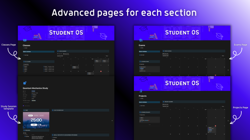 🔹 Study Sessions - place for storing all your study sessions in one place, it comes with custom template for each study session with Pomodoro Timer, Resources & place for dumping your notes. Your place for studying.