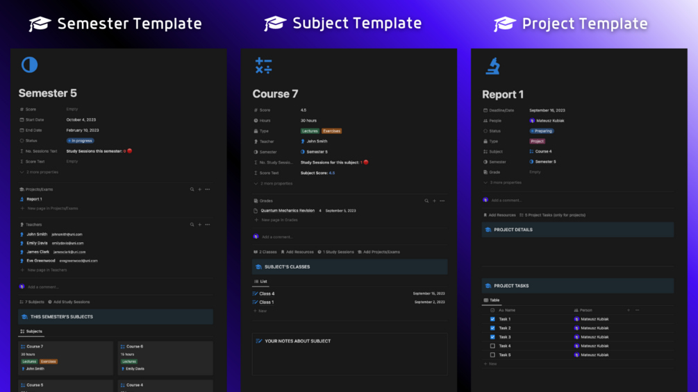 🔹 Dashboard - everything you need for your current semester. Navigation with links to every page, Class Schedule (your weekly plan), Quick Actions for easy capture & mobile use (yes, this template is also mobile friendly), Current Semester’s Subjects, Classes, Projects, Exams, Grades, Teachers, simple To Do List, Calendar with all deadlines & planning your day - everything in one place.