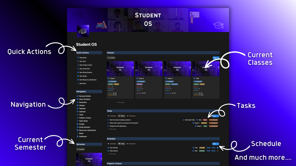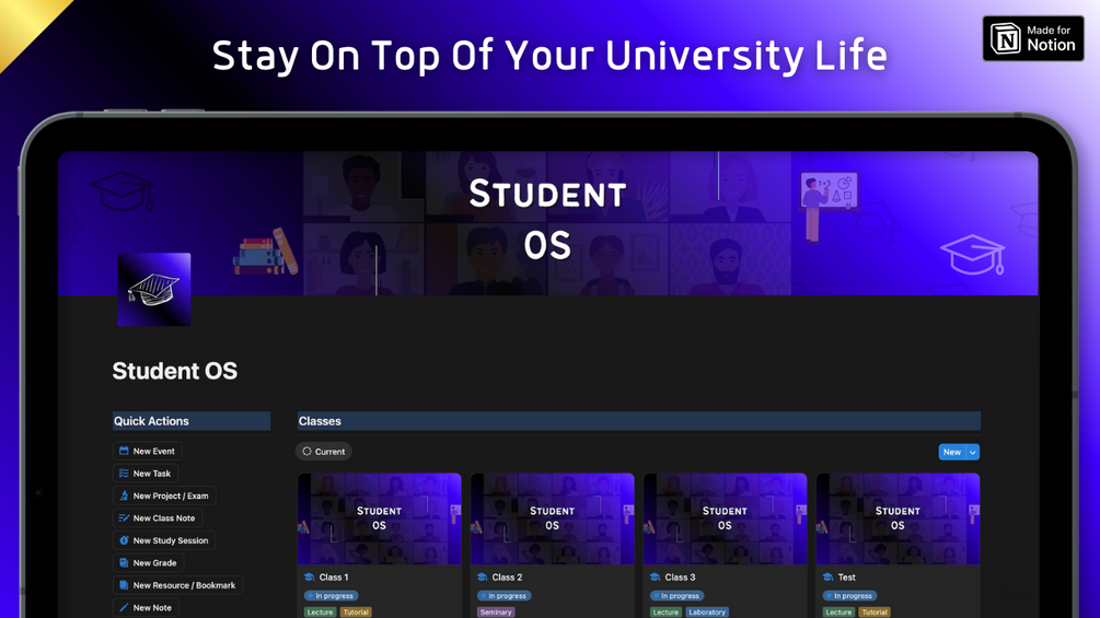 🔹 Student OS Notion template where you can organize your personal and university details, semesters, classes, attendance, teachers, calendar, tasks, projects / exams, class notes, grades, study sessions, resources and notes in a systemized way and store everything associated with your studies in one place