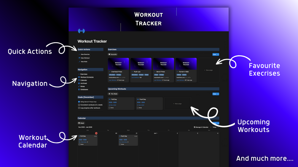 🔹 Workout Tracker Notion template where you can organize your exercises, workout schedule, calendar and notes and store everything in one place